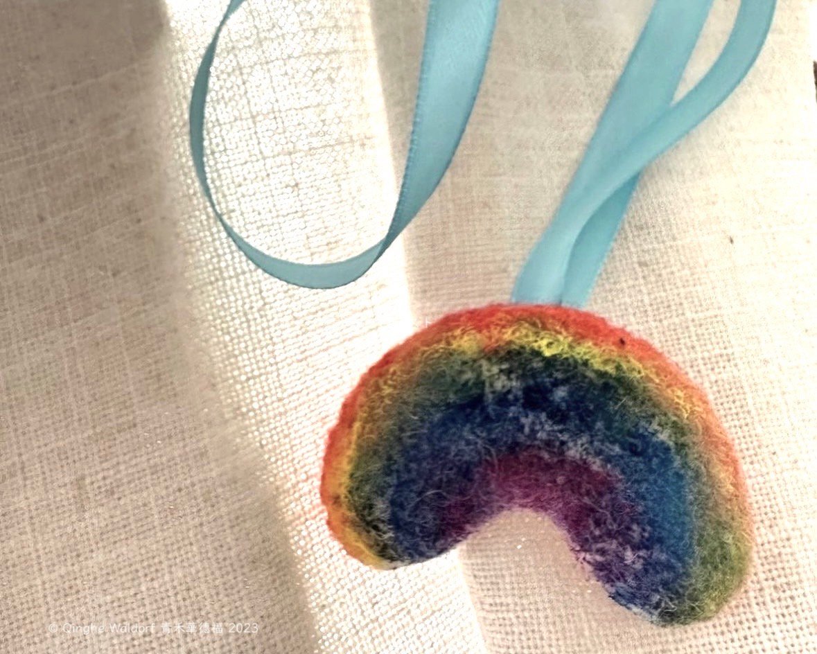 故事告一段落後,老師為每一位孩子親手戴上羊毛氈彩虹項鍊,由助理老師陪伴,每位孩子獨自走過彩虹橋(平衡木),主帶老師則等在橋的另一頭迎接孩子,並且彎下腰跟孩子悄悄的說一些話。