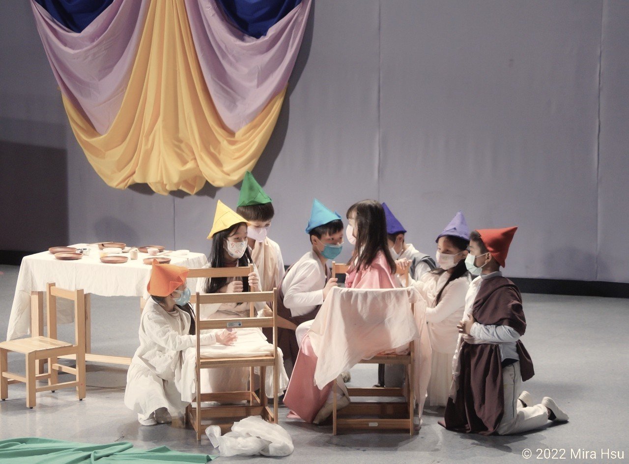 從小孩子就有各種各樣的戲劇演出,包含母語與外語。戲劇在華德福學校是集大成的學習,包含:藝術、音樂、語言,還有感受、合作與解決問題的能力。圖為三年級孩子演出德文戲劇《Schneewittchen白雪公主》。