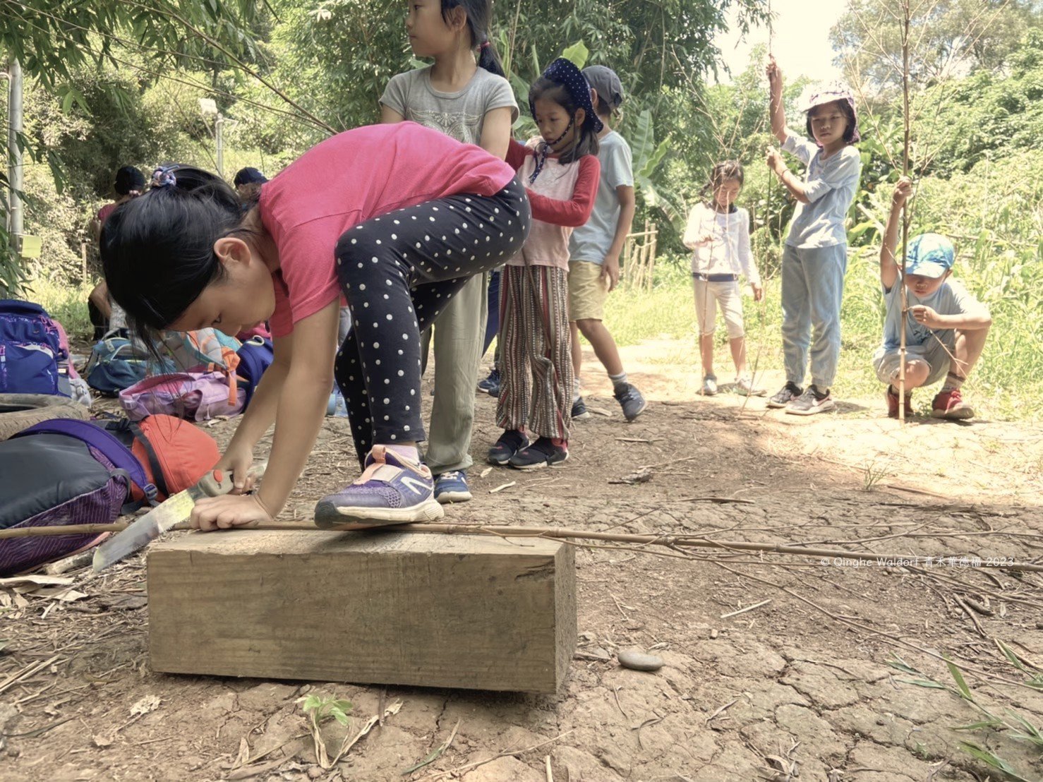 從入學之後,孩子們就會在校園花圃中、在教室裡工作,學習使用各種工具,直到孩子能夠善用工具解決問題、便利生活所需。圖為四年級孩子在山上農地處理竹子,用於製作夏季慶典射日活動的竹箭。
