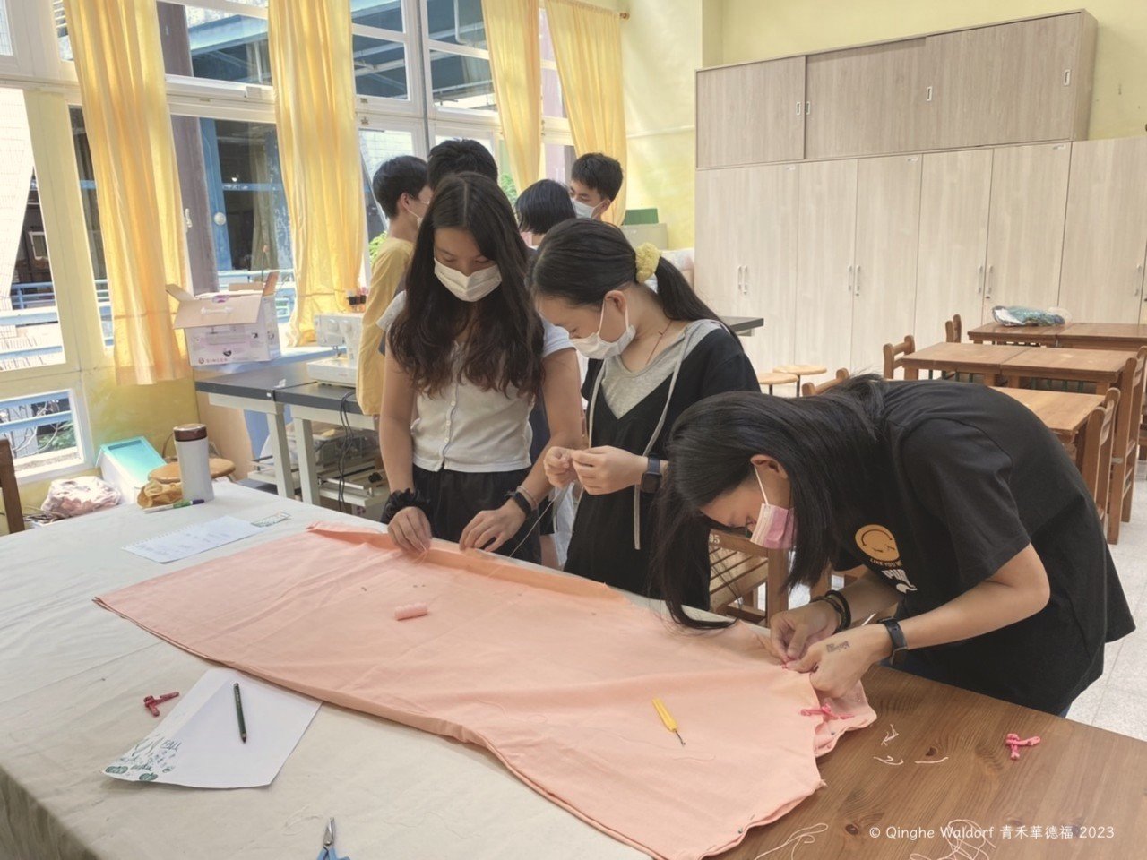 孩子從一年級開始的手工課,鍛鍊出靈巧的雙手,使用雙手去創造各種事物,其中也包含著精確性。精確與否決定了作品能否完成,不論是笛袋、帽子或鞋子,都是如此。圖中是九年級的學生製作戲劇公演的戲服,對精確的要求在此時進入高峰。